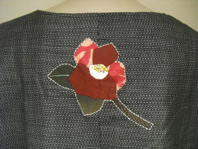 片面は亀甲の大島紬です。 古布ですので芯を貼りました。 素材は正絹です。 後に椿の花を布を組み合わせてパッチワークと刺し子で作っています。