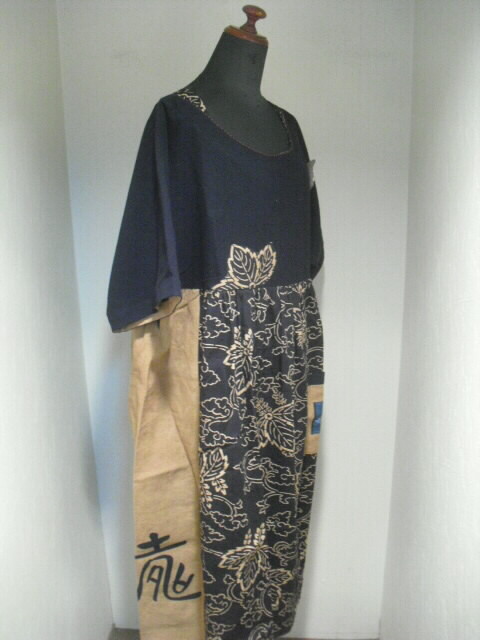 藍染無地と風呂敷を組み合わせて作った個性輝く素敵なワンピースです。