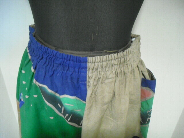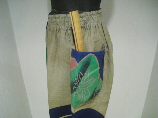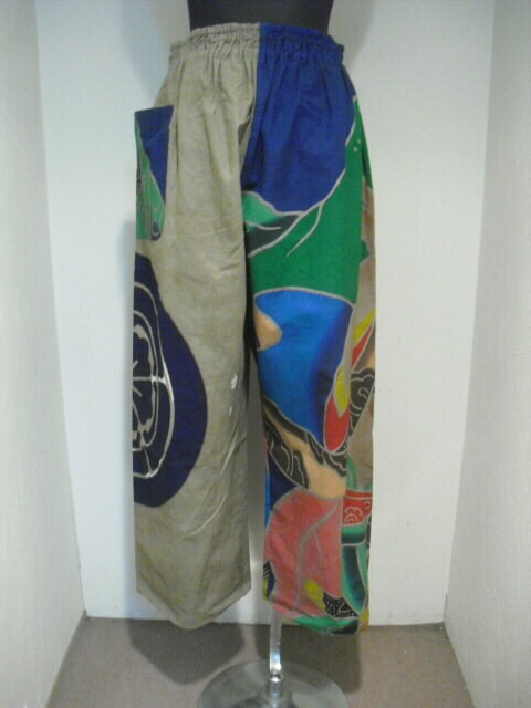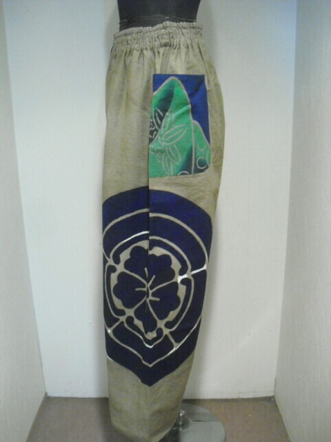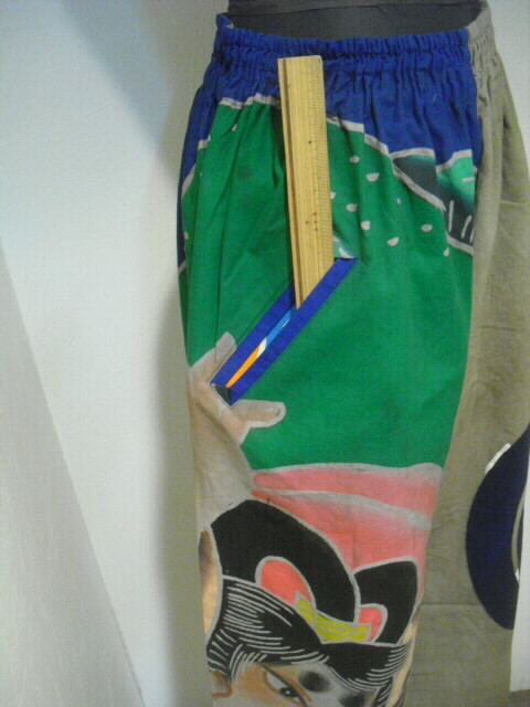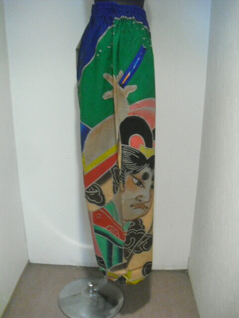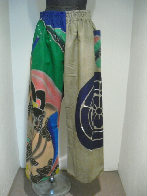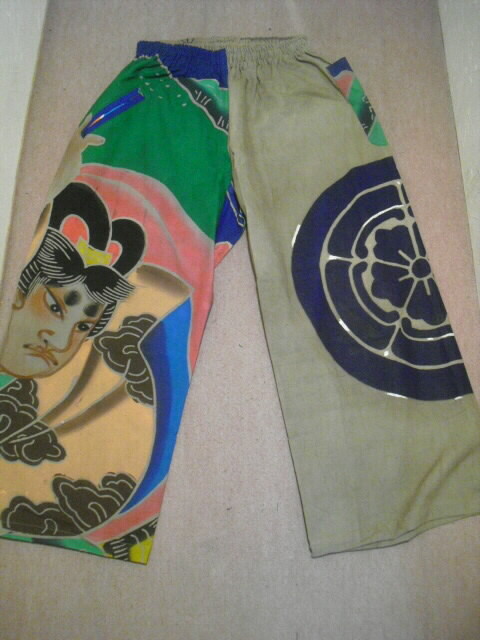 古布の「武者絵幟(のぼり)」を天然染料の柿渋で染めてパンツへリメイクしました。