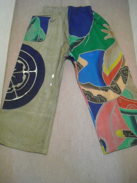 パンツの右側には武者絵の絵柄部分(牛若丸)を使い、左側には家紋部分を使っています。