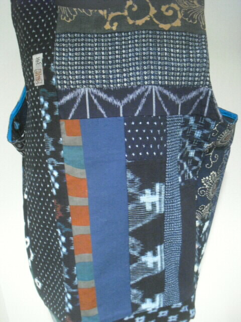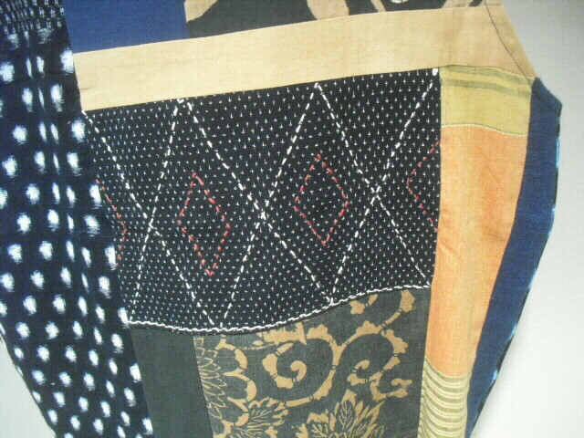 書生絣、雪ん子絣、絵絣、型染め、柿渋染めした大漁旗を組み合わせています。