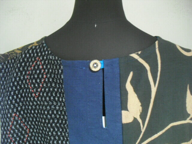 袖ぐりと衿ぐりには幅1cmの柿水色のバイアステープを付けています。