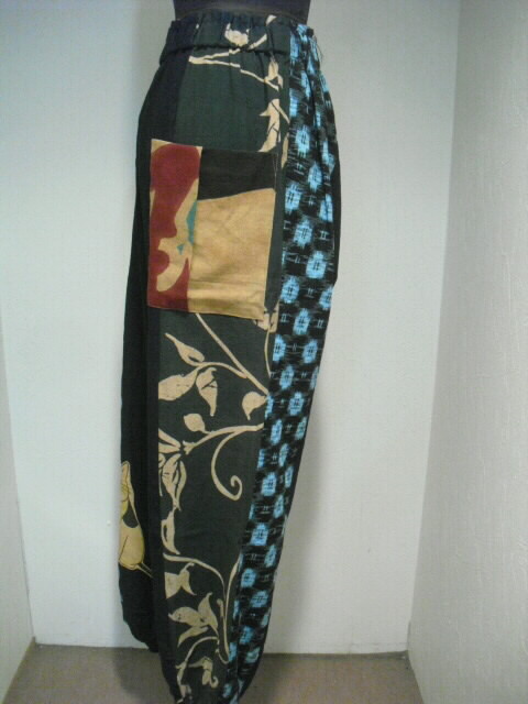 前後共に藍染無地を使い右サイドに2種類の絣、左サイドに緑色の柿渋染めした風呂敷と絵絣を入れました。