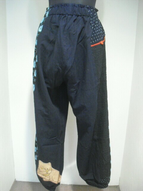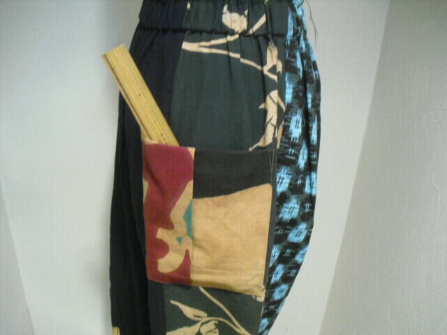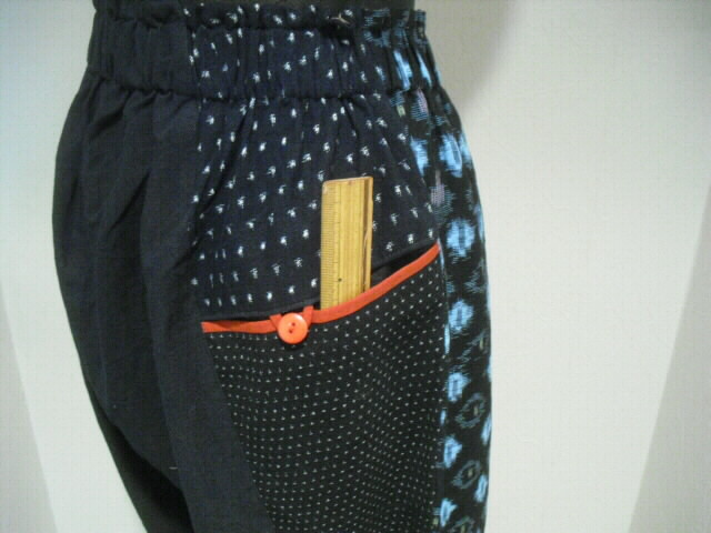 ポケットは前の左に柿渋染めした大漁旗で作った深さ18cm×口幅16cmの貼り付けポケット、後の右のお尻部分に深さ23cm×口幅14.5cmを付けています。