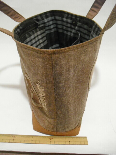 ×口幅 19cmのオープンポケット。 「かぶせ布」の外に深さ15cm ×口幅 20cmのファスナーポケットを付けています。 底板付きです。 重いものを入れても型崩れを防ぎます。 柿渋染めは生地を丈夫にして使い込むごとに色目を増すのが最大の特徴です。 ご自分だけの味わいの色に育てあげてください。 価格 14,800円