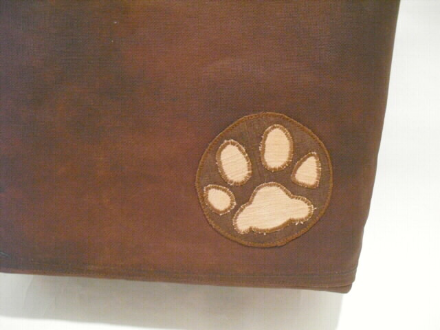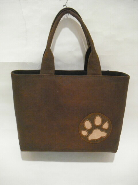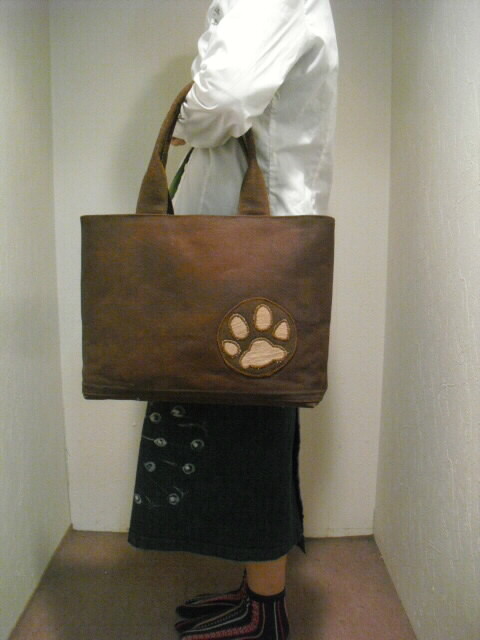 この酒袋に醤油袋と柿渋染め綿生地を組合せました。 それぞれの布の色合いの違いを生かして猫をパッチしました。 反対側には足裏の肉球をデザインしています。