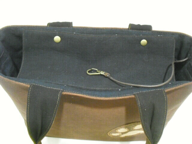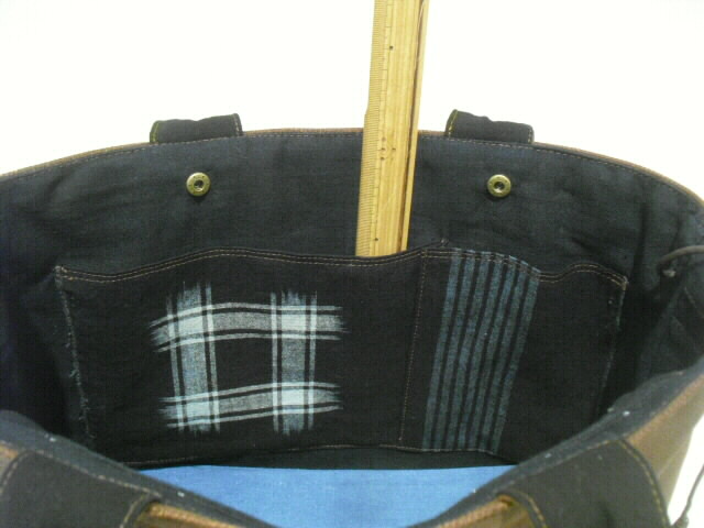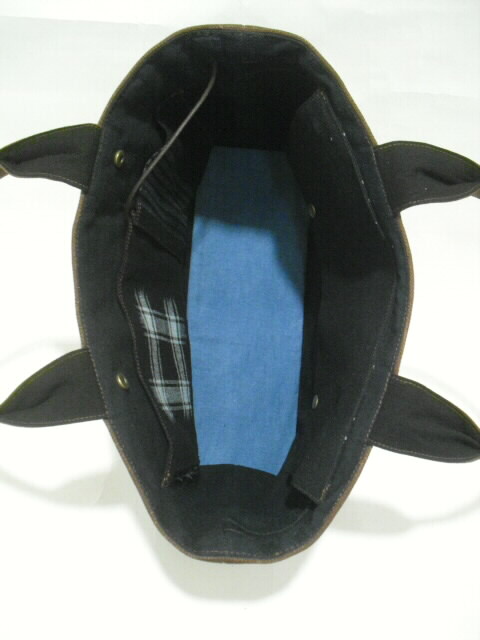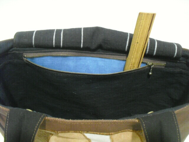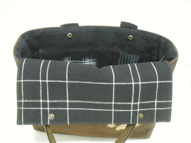 中には綿の裏地を付けています。 開け口には2ヶ所のボタンで留める「かぶせ布」を付けました。 「かぶせ布」を付けるとバッグの中身が見えませんので防犯にも有効です。