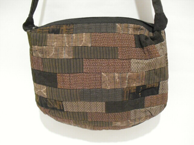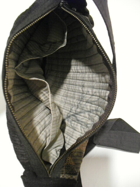 開閉はファスナー式です。芯は入っていますがふわふわした柔らかい手触りです。折り曲げる事も出来ますのでご旅行時のサブバッグとしても携行できます。高級着物素材『大島』を贅沢に使った周りの視線を惹きつける♪お洒落な手づくり一点モノのバックです。価格 6,500円