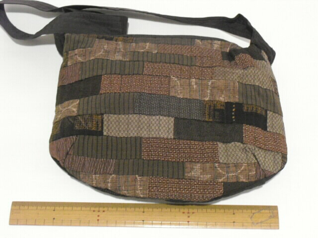 素材・・・ 着物(絹・綿)サイズ・・・幅28cm×高さ24cm×底幅0cm(マチなし)持ち手・・・着物使用 長さ80cm、幅 3.5cm特徴・・・数種類の着物を使いショルダーバック(ポシェット)へリメイクしました。高価な素材を使い、時間をかけて丁寧にお仕立てしました。手のかかったパッチワークで独自のデザインにこだわりながら大島独特の光沢と柄を生かしました。表と裏は、まったく違うデザインにしていますので両面で違う表情も楽しめます。ポケットは中に2個ついています。