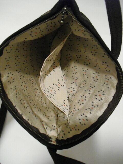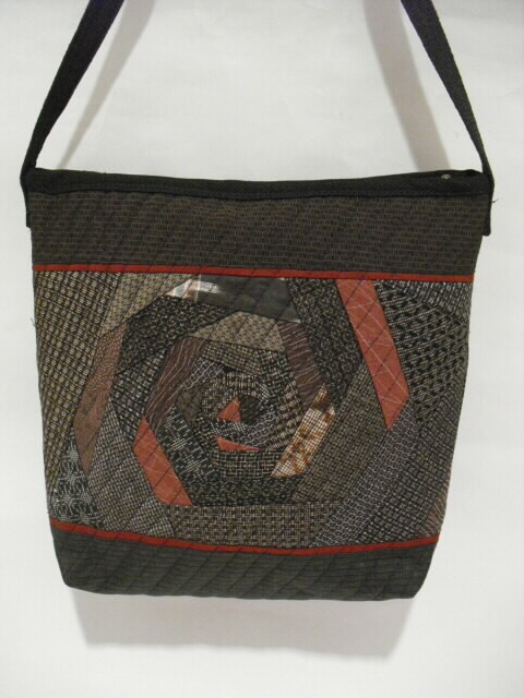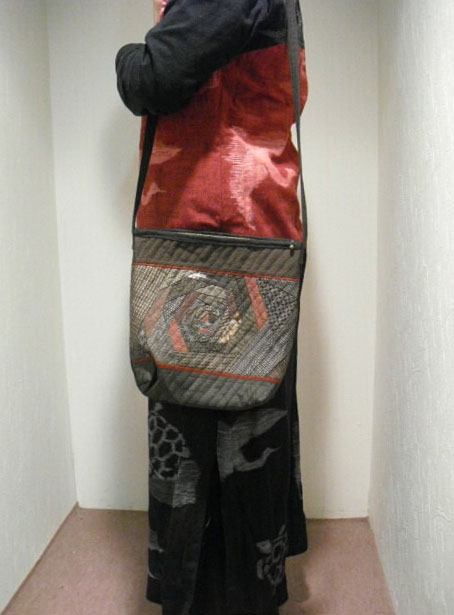 開閉はファスナー式です。芯は入っていますがふわふわした柔らかい手触りです。折り曲げる事も出来ますのでご旅行時のサブバッグとしても携行できます。高級着物素材『大島』を贅沢に使った周りの視線を惹きつける♪お洒落な手づくり一点モノのバックです。価格 6,500円