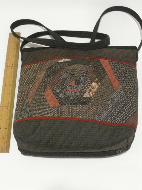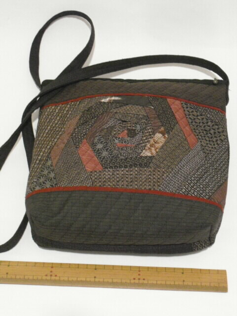 素材・・・ 着物(絹・綿)サイズ・・・幅25cm×高さ23cm×底幅6cm持ち手・・・着物使用 長さ112cm、幅 1.5cm特徴・・・数種類の着物を使いショルダーバック(ポシェット)へリメイクしました。高価な素材を使い、時間をかけて丁寧にお仕立てしました。手のかかったパッチワークで独自のデザインにこだわりながら大島独特の光沢と柄を生かしました。表と裏は、まったく違うデザインにしていますので両面で違う表情も楽しめます。ポケットは表に口幅16cm、深さ15cmが1個。中に2個ついています。