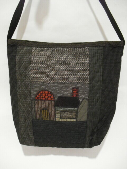 家の形をパッチワークで型取り、遊び心たっぷりのバッグが出来ました。