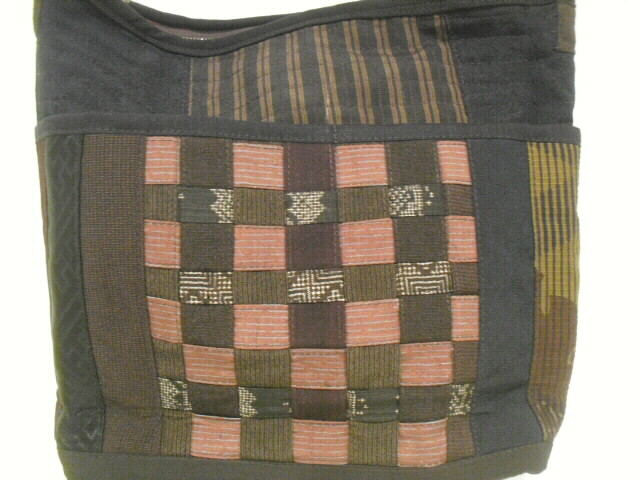 特徴・・・ 大島の着物をベースに数種類の古布の着物を組合わせて作った手さげバッグです。 高価な素材を使い、パッチワークとステッチで時間をかけて丁寧にお仕立てしました。 周りの視線を惹きつける個性的なデザイン♪