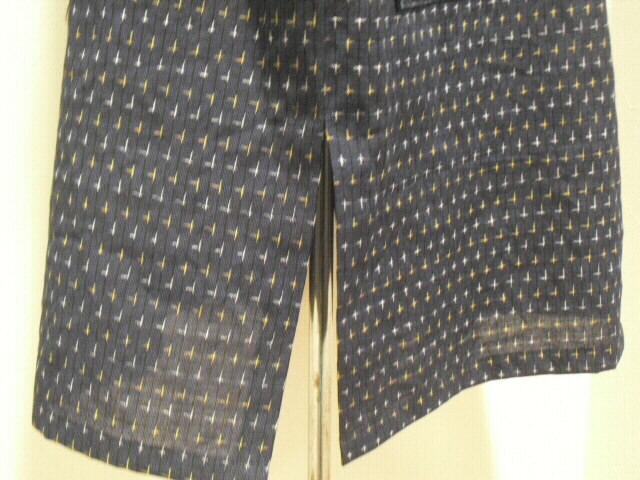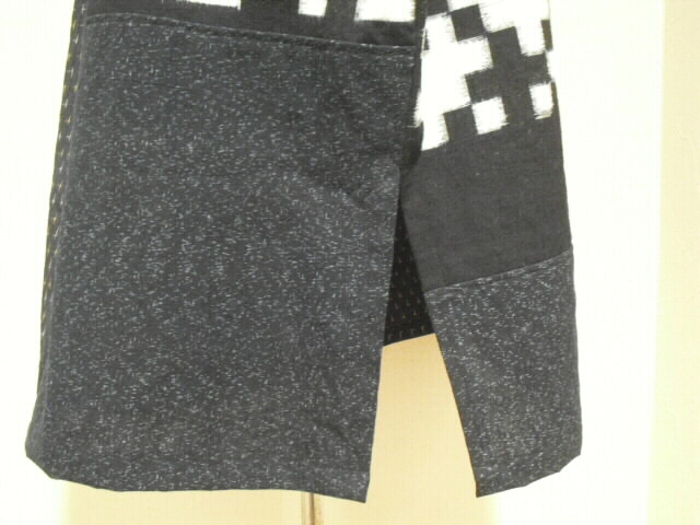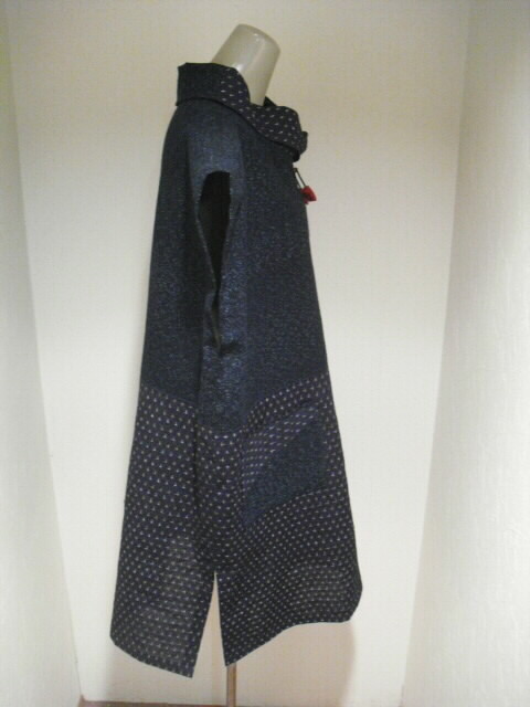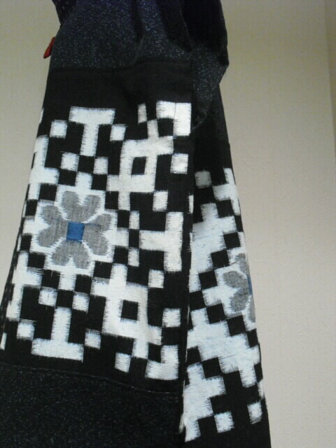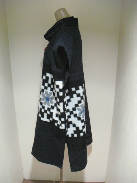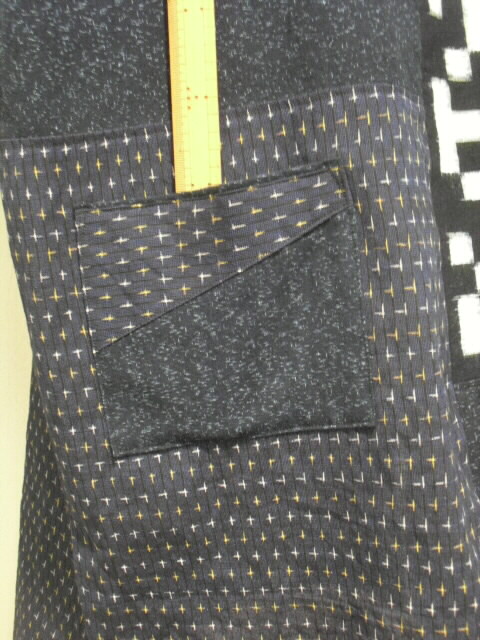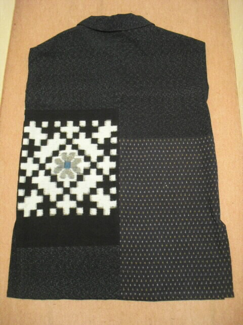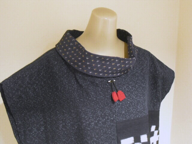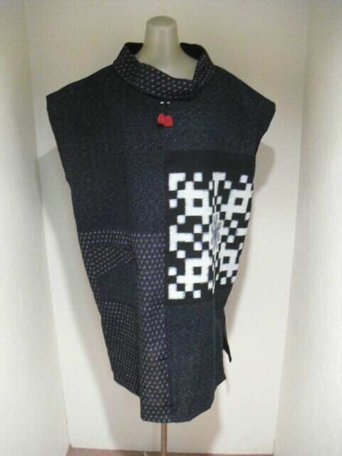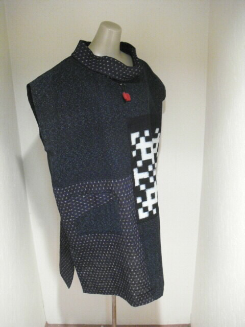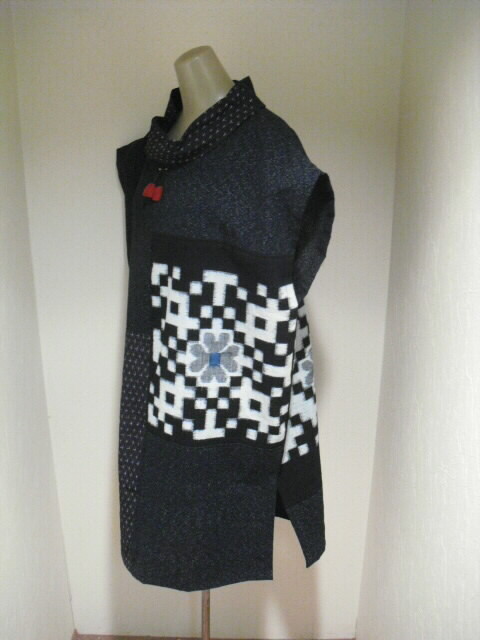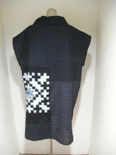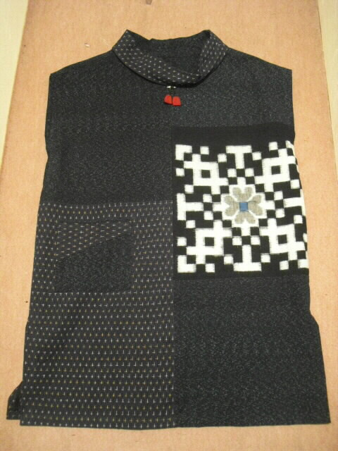 2種類の絣と古布の布団皮(ふとんがわ)を組み合わせた衿付・ノースリーブのチュニックです。