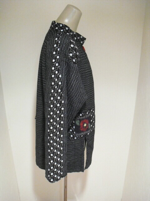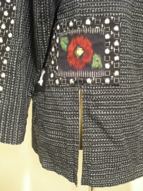 口幅14cm×深さ11cmのポケットを右脇につけています。 ポケットの椿の絵絣がポイント。 赤い花がアクセントになり可愛らしさを引き出しています。
