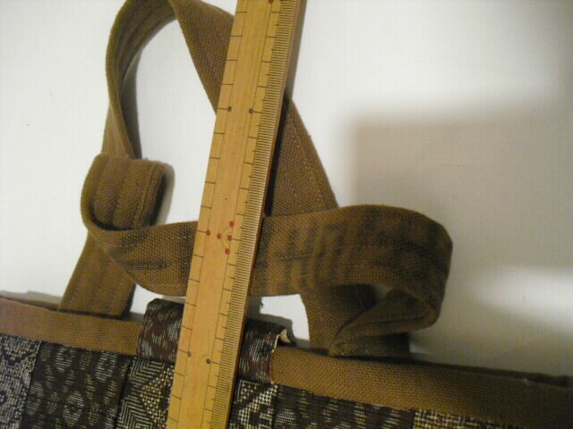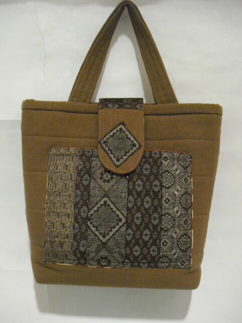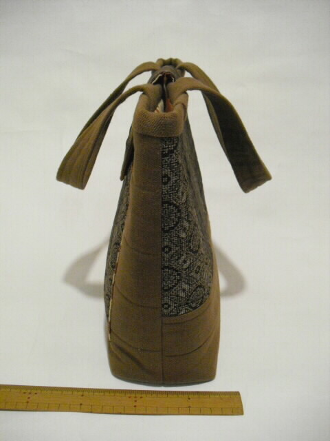 酒袋(さかぶくろ)は、造り酒屋で「もろみ」を入れてお酒を絞るのに用いた袋です。 手織木綿に柿渋を塗ってできており使い続けるほどに味わいが出る生地です。 平織りで織られた厚手の布で、強度・耐久性・通気性に優れ、色に淡いムラがあるのが特徴です。 今は「もろみ」は機械で絞りますので酒袋はほとんど使われません。 近年の和風ブームで、そのムラの美しさが見直され、バッグや小物、インテリアに活かされるようになり人気が高まっています。 この酒袋と大島の着物を組合せました。 それぞれの生地を丁寧にパッチワークしました。 表には深さ16cm