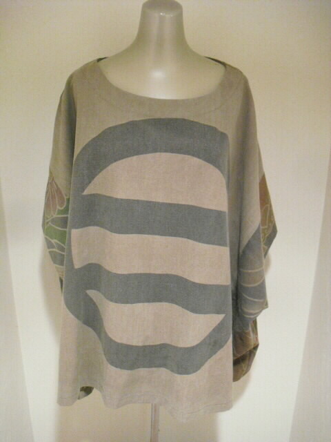 上着のデザインは人気のポンチョ式です。スッポリかぶれるデザインで、体型を気にすることなく、ゆったりと楽に着ていただけます。衿はシンプルな丸首なので下にハイネックや襟付きのものを着られます。