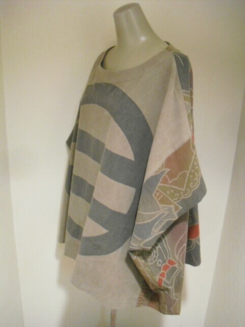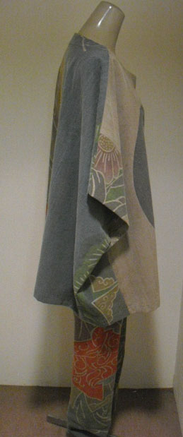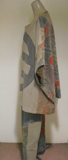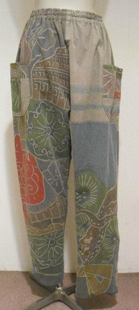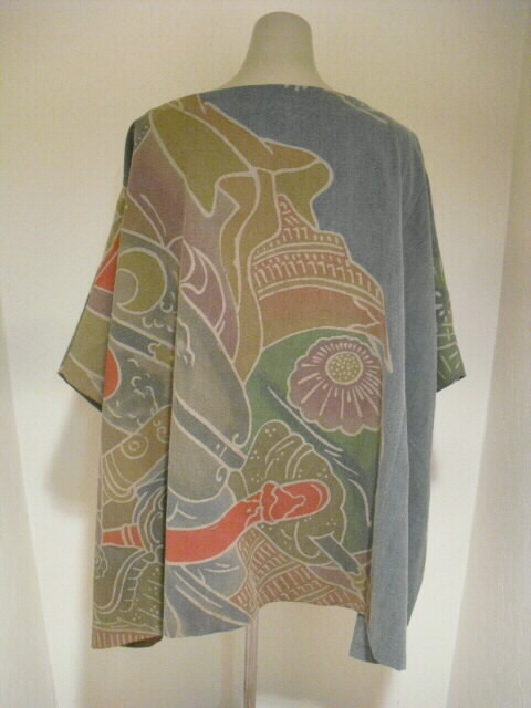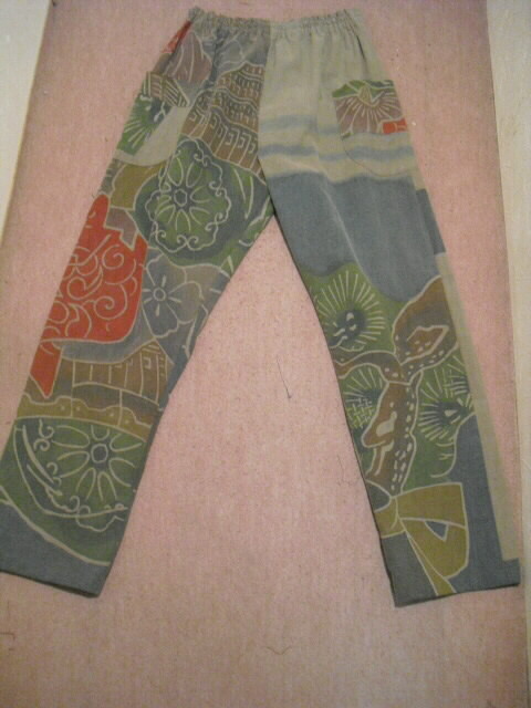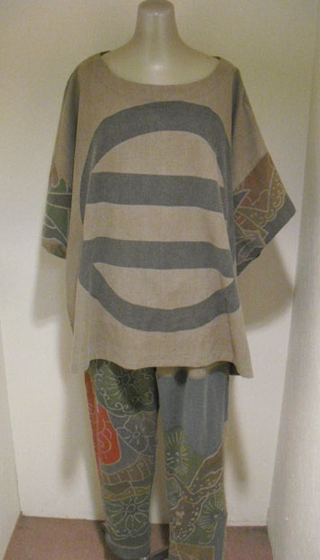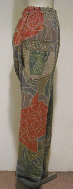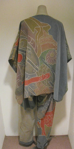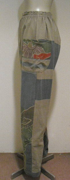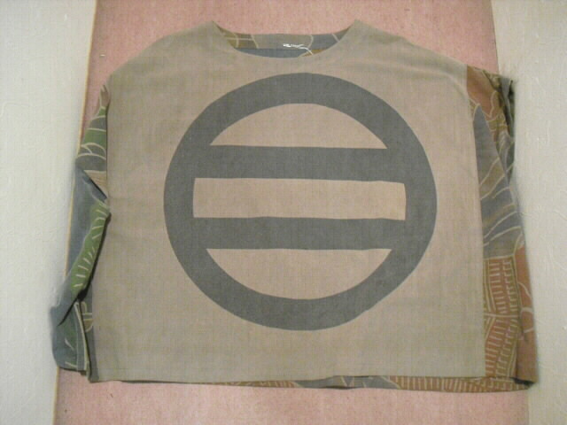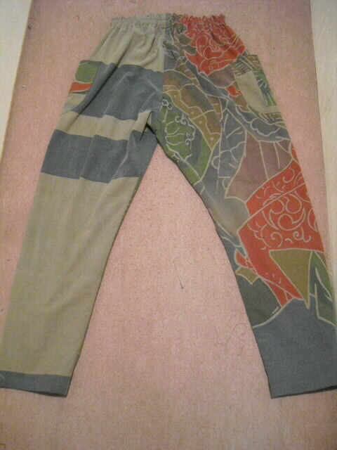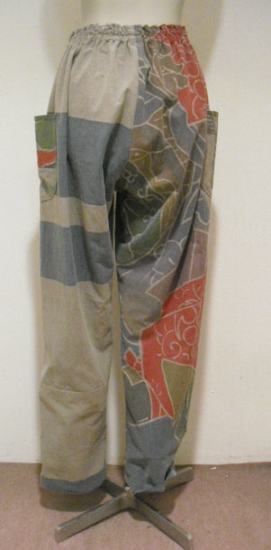 このパンツスーツは高価な幟旗を2種類使っています。上着の前は幟旗の家紋部分。家紋は「丸に三つ割り二つ木」です。後は絵柄部分を使っています。前と後で、まったく違ったイメージです。