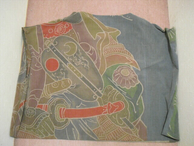 旗の絵柄は「川中島の合戦」比較的に古い武者絵幟ですが生地はしっかりしていました。古布ならではの腰の折れたやさしい手触りです。 「武者絵幟」は主に甲州、中部、九州地方などで5月の節句に立てられますが少子化、住宅事情で年々数が少なくなり高価なリメイク素材になっています。