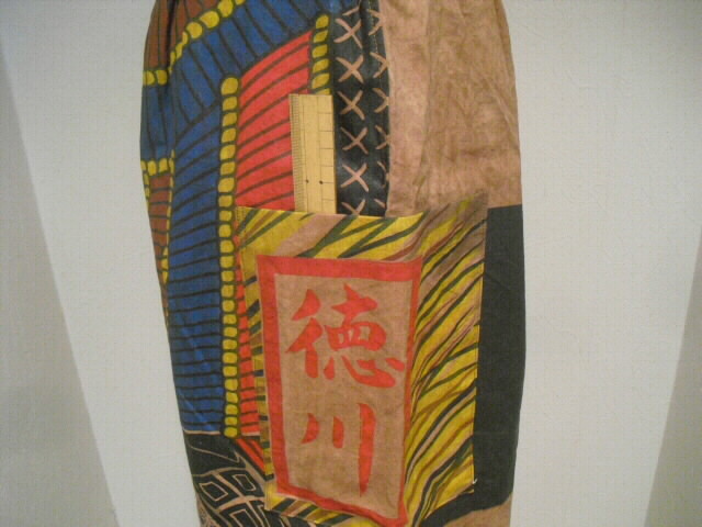 古布の「武者絵幟(のぼり)」を天然染料の柿渋で染めてパンツへリメイクしました。