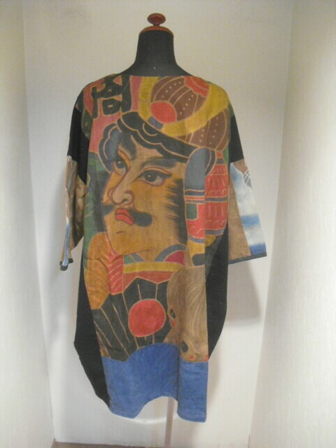 武者幟旗に藍染め白抜き古布の幕を組み合わせて作ったコクーンチュニックです。