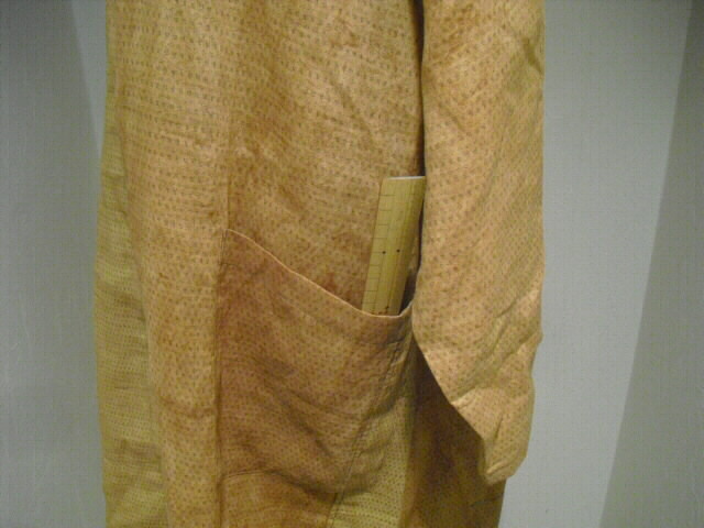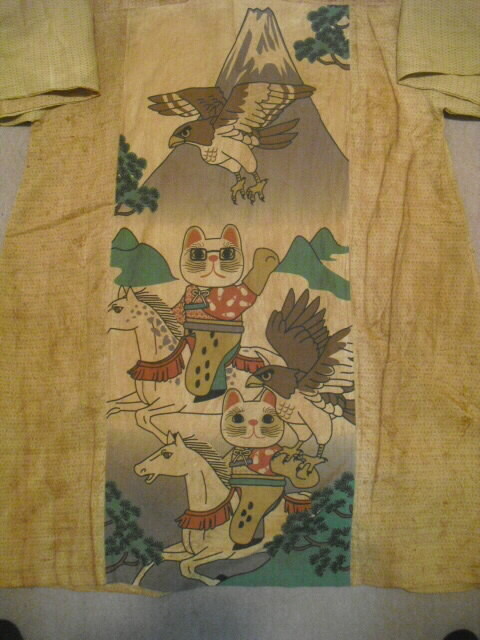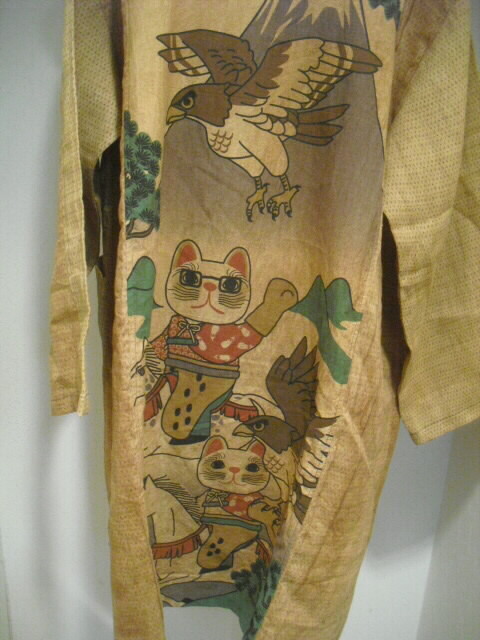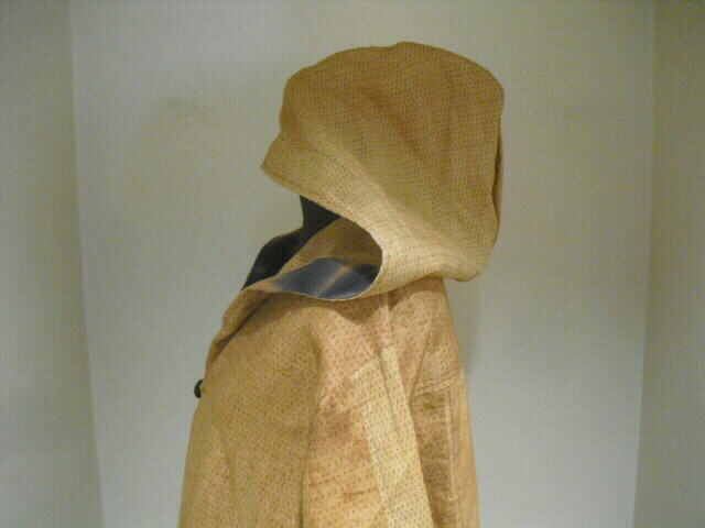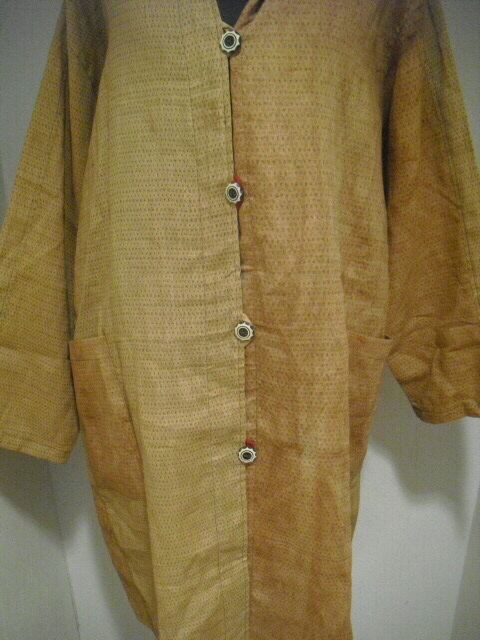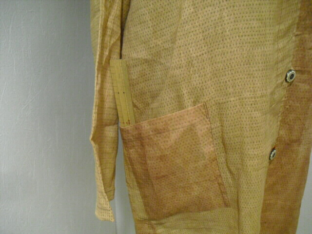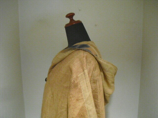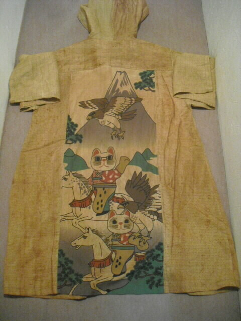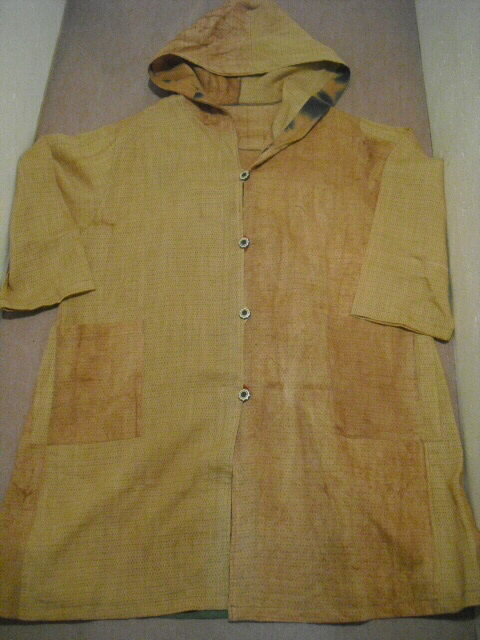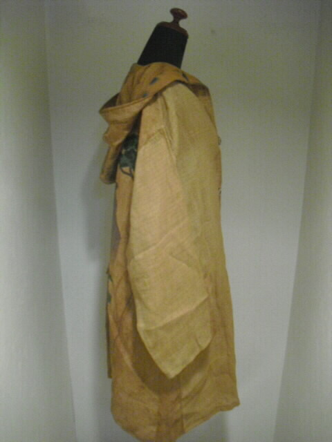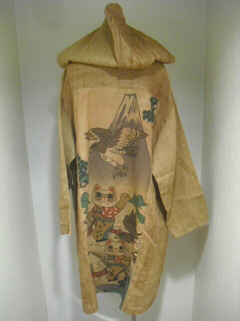 柿渋染めした麻布で作った個性輝くロングコートです♪ ![]() 背中には可愛いネコの手ぬぐいを組み合わせています。 ![]() 袖は長袖。フード付きです。 着丈は94cm。 Aラインのロング丈でバストとヒップも余裕のサイズ。 ゆったりしたサイズの楽な着心地です。 ![]() 素材は薄手の麻ですので耐寒性はありません。 お肌の日焼け防止として春先から秋口にかけてお洒落に着こなしてください。 ![]() 麻の白絣と木綿の日本手ぬぐいを天然染料の 柿渋で染色して組み合わせて作っています。 ![]() 柿渋の微妙な染めムラや染め色の違いが面白い アクセントになっています。 ![]() 前開きで4個のボタンを付けています。 ボタンの大きさは直径2cmのお洒落なボタンを選んでいます。 ![]() 両脇には口幅18cm×深さ20cmの大きめのポケットを付けています。 ![]() ![]() 後にの中心には幅33cm×長さ81cmの 柿渋染めした日本手ぬぐいを組み合わせました。 ![]() 絵柄は、富士に鷹、馬に乗ったネコの柄です。 和の雰囲気漂う可愛らしい柄を使いました。 遊び心タップリのお洋服です。 ![]() 大きなフード付きの衿も特徴的。 ![]() フードの大きさは高さ35cm、幅(奥行き)28cmです。 ![]() 日差しの強い日はこのフードも役に立ちます。 ![]() 【前】 素材の麻は通気性が良く、また吸水性があり、速乾性にも優れているのが嬉しいです。 暑い夏でも涼しく、インナーの組合せで長い期間着ていただけます。 ![]() 【後】 周りの視線を惹きつける事。間違いなし 素敵なこのコートであなたの個性を輝かせてください。