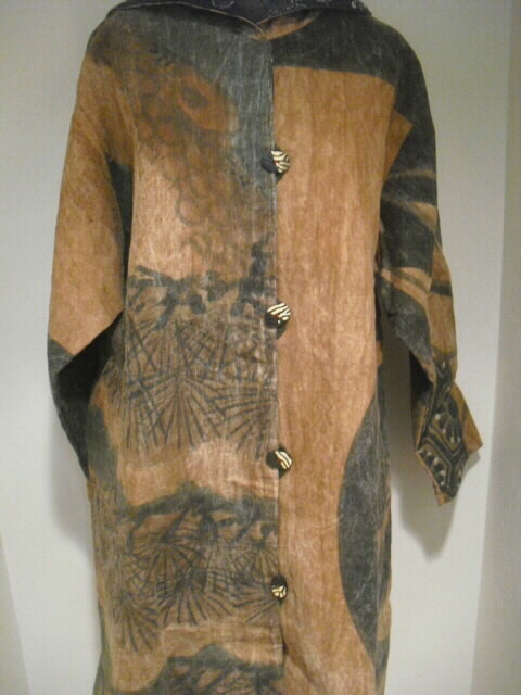 古布の「武者幟(のぼり)」をリメイクした個性輝くロングコートです♪ ![]() 大変高価な昔の幟旗を使って仕立て上げました。 「武者幟」は主に甲州、中部、九州地方などで5月の節句に立てられます。 少子化、住宅事情で年々数が少なくなり高価なリメイク素材になっています。 ![]() フード付きですので耐寒性もあり、おしゃれに着ていただけます。 ![]() 色合いの派手さを抑えるために天然染料の柿渋で染色しています。 ![]() 柿渋染めは、その昔は、酒袋を染めたり、番傘に塗ったりしていました。 柿渋で染めると生地が強くなる上、 柿渋の中にある「柿タンニン」には 消臭・防腐・抗菌の効果があります。 太陽の染と言われており、太陽をいっぱい浴びだんだんと渋い色が出て来るのが特徴です。 ![]() このコートにリメイクした武者のぼりは手描きのかなり昔の旗です。 ![]() 昔の旗は染料が色落ちします。 何度も洗い、色落ちさせた後に柿渋で染色しました。 ![]() カスレ、色ムラ、染めムラが逆に個性的で味わいのある旗になり、素敵なお洋服に仕上がりました。 ![]() 前身頃の松の絵、左身頃には家紋(丸に桔梗)を配置しました。 ![]() ![]() 後は武者を大胆に配置しています。 ![]() 柿渋で染まった白地と黒地の部分を多く使っています。 色合いが少ないので派手さが苦手な方にも着ていただけます。 ![]() 生地の厚さは普通地。 厚手でもなく、薄手でもない中間の生地厚でしっかりした綿素材です。 ![]() 前開きで一番上はスナップボタン。 下には4個のボタンを付けています。 ボタンの大きさは縦2cm、横2.8cmの楕円形のお洒落なボタンを選んでいます。 ![]() 大きなフード付きの衿も特徴的。 フードの大きさは高さ30cm、幅(奥行き)28cmです。 ![]()