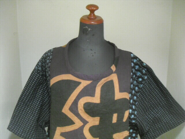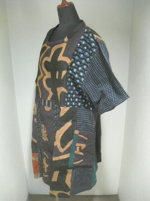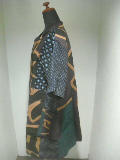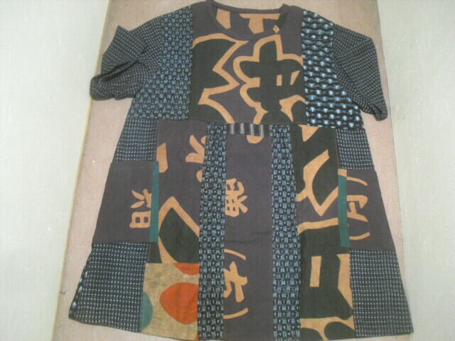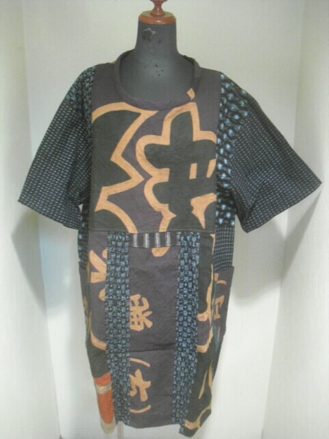 柿渋染めした大漁旗と絣(かすり)を組み合わせて仕立てた個性輝くチュニックです。