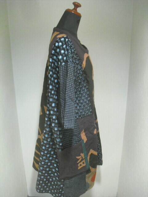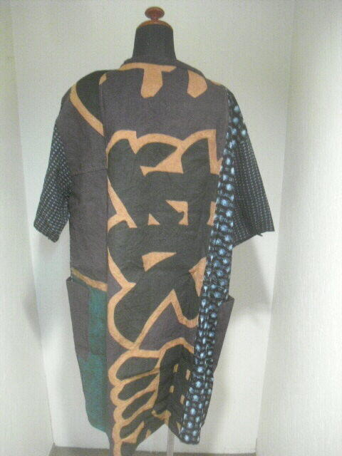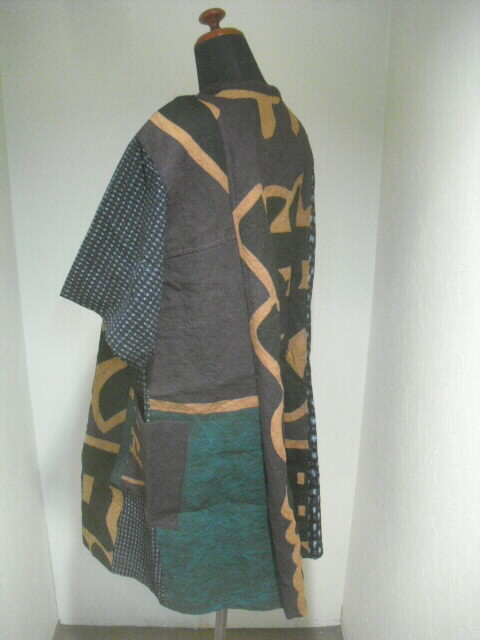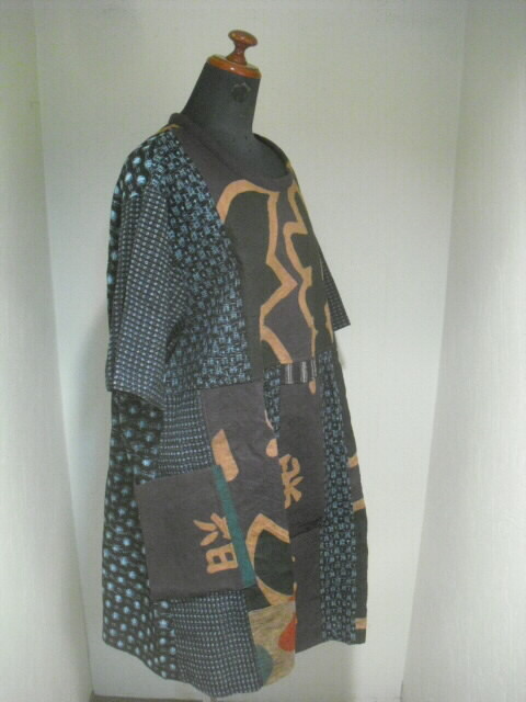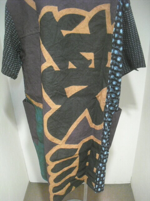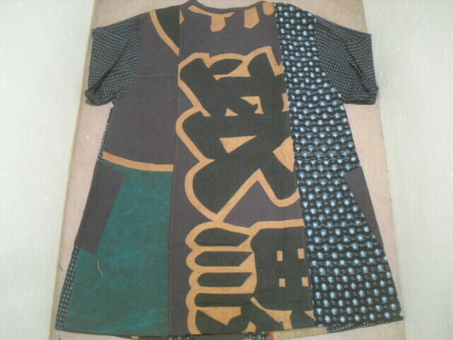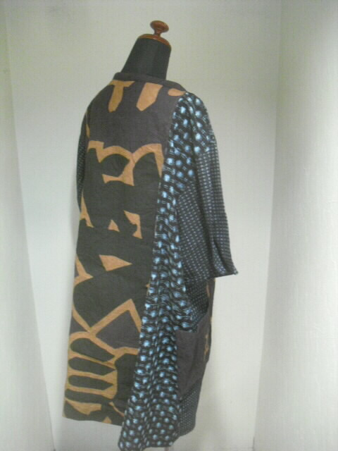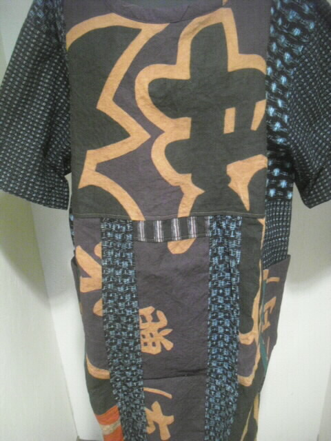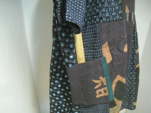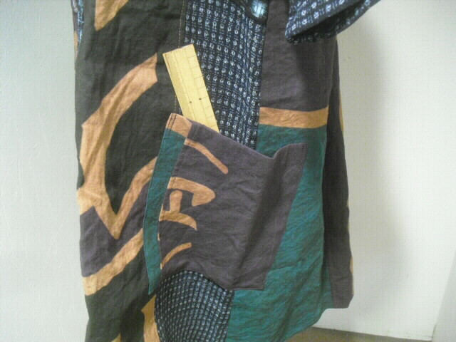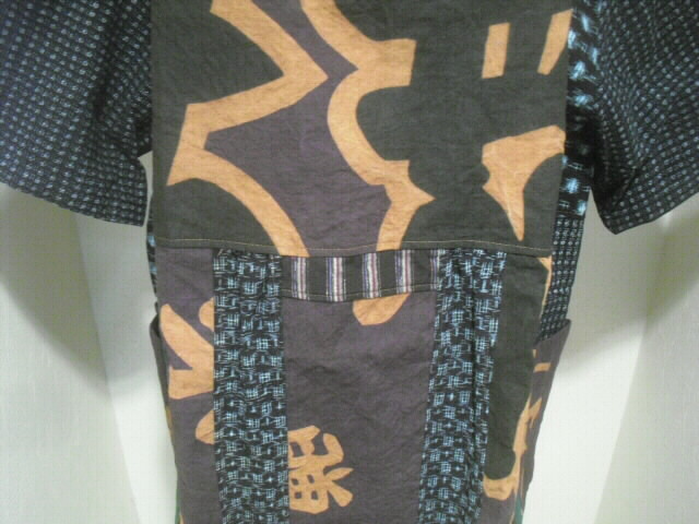 前はウエスト部分で横に切り替え上は真中に柿渋染めの大漁旗、左右に絵絣を入れ両袖は書生絣で作りました。