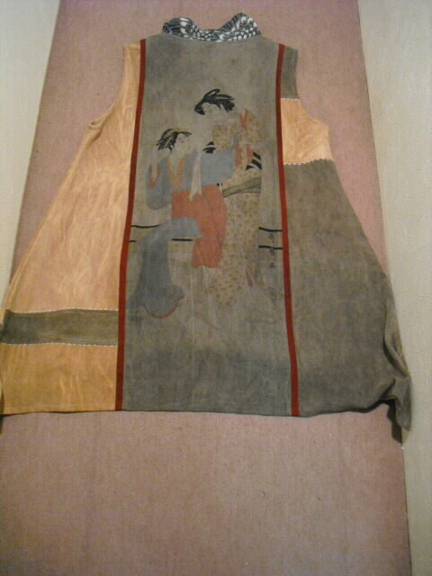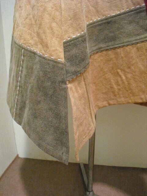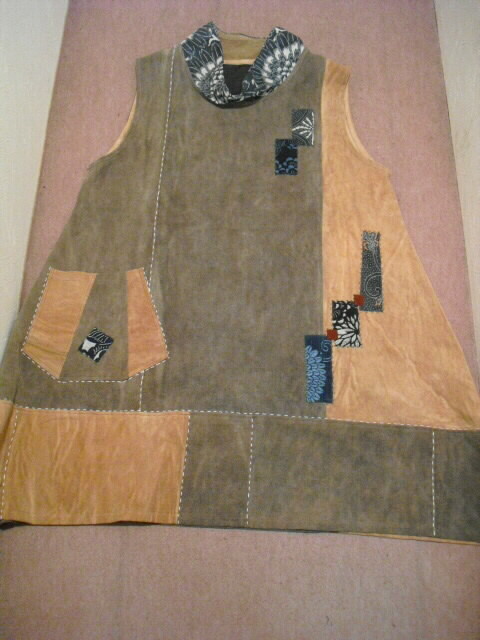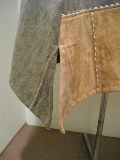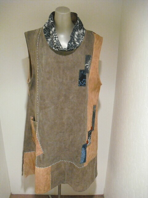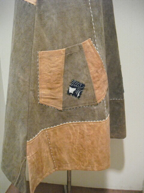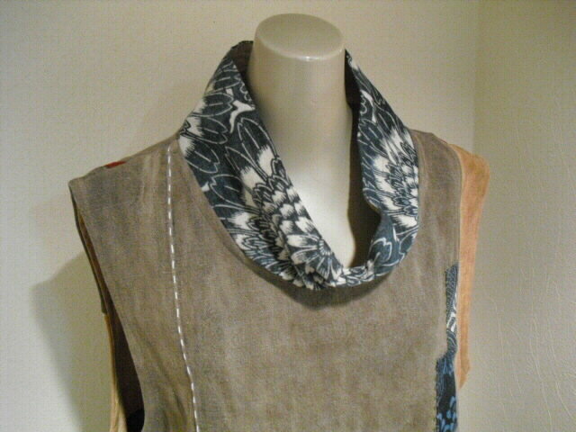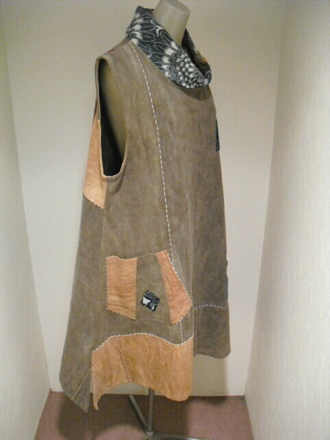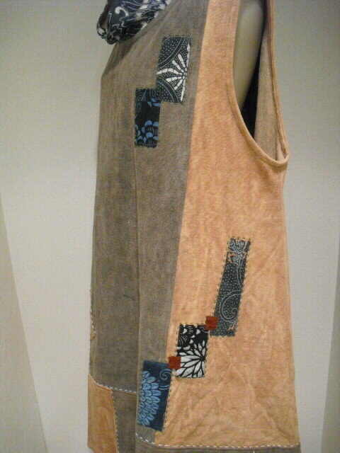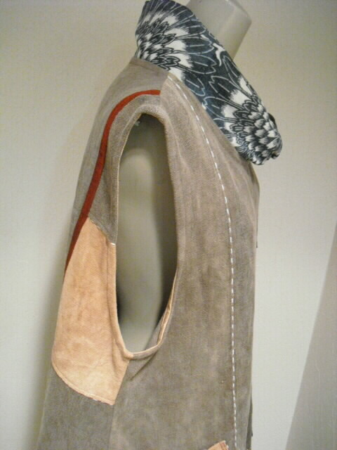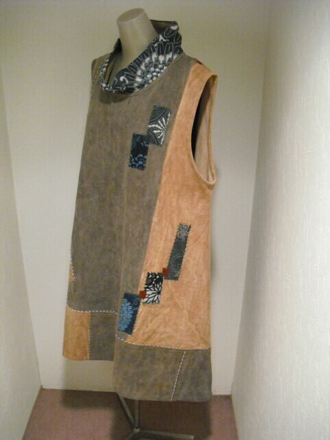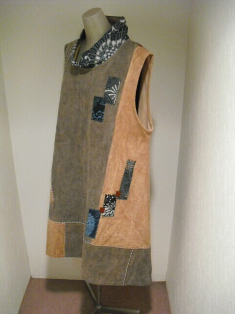 柿渋で染色した酒袋、日本手ぬぐいに古布の型染めハギレを組合わせて作ったチュニックです。