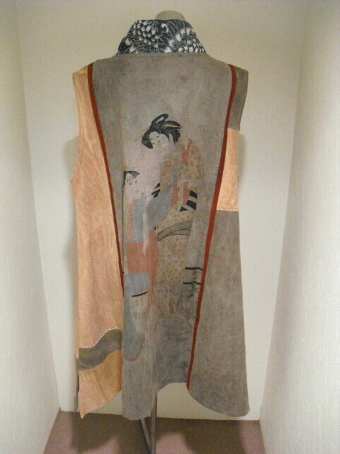 背中に配置した美人画の日本手ぬぐいは、柿渋染めをしてから鉄媒染で仕上げています。