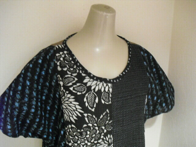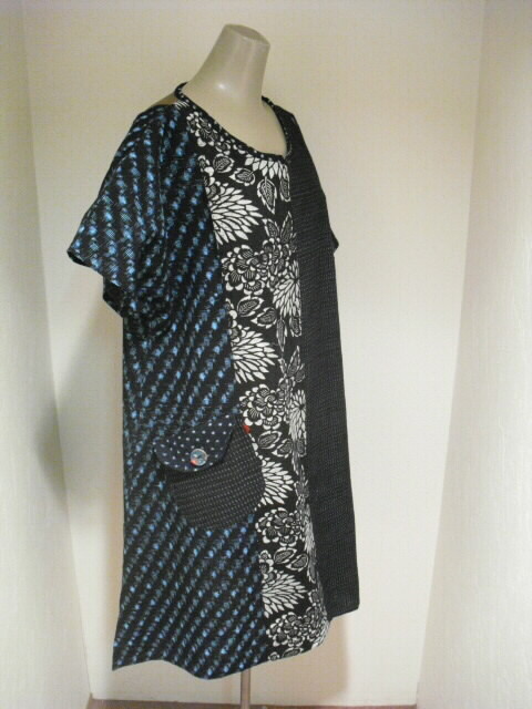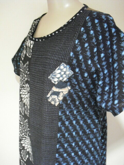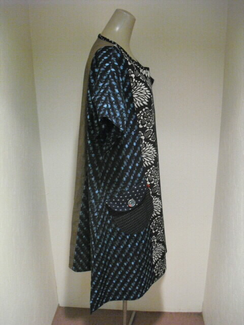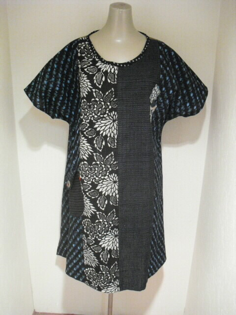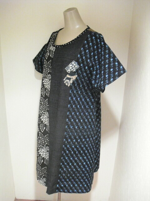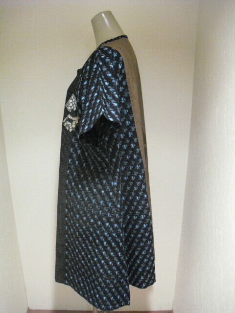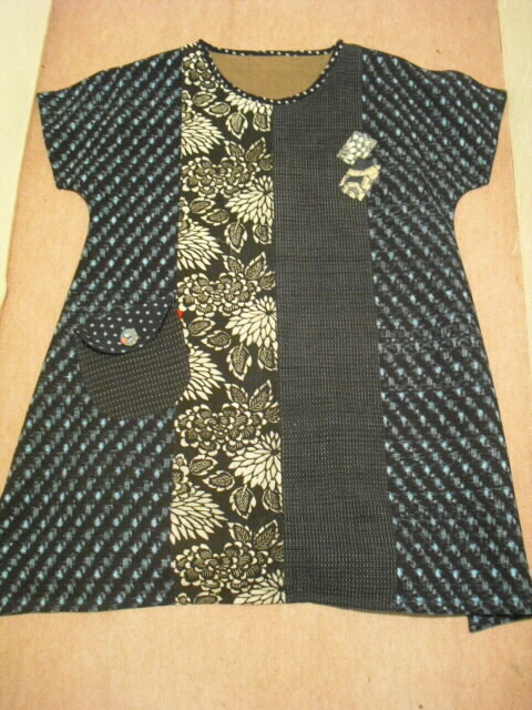 絣、古布の型染めハギレ、鉄媒染した日本手ぬぐいを組合わせて作ったチュニックです。