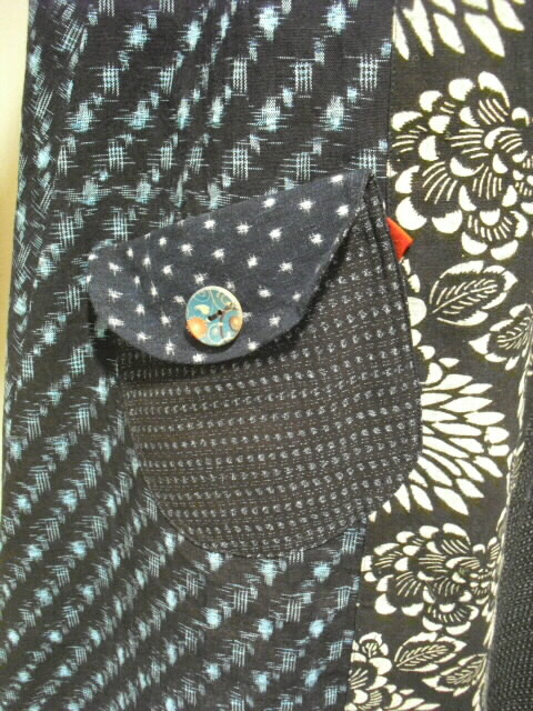 前の2ヵ所の型染ハギレのパッチも遊び心もたっぷりで面白いポイントです。