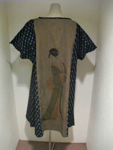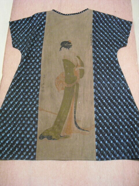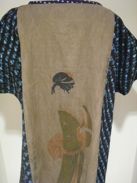背中に配置した美人画の日本手ぬぐいは、柿渋染めをしてから鉄媒染で仕上げています。 渋めの色と柿渋色の配置に苦労しました。