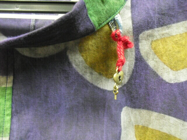 衿元には、ループ紐に赤い紐の飾りを提げました。 遊びごごろがあって、可愛いアクセントになっています。 取り外しできますので他のアクセサリーを付けてもOKです。