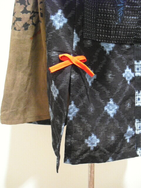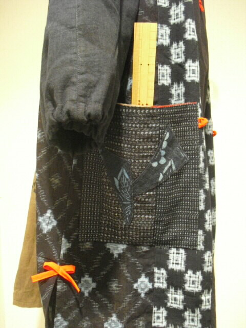 ポケットは左右に書生絣を使い、型染めハギレをパッチした深さ20cm×18cmの 貼り付けポケットを付けています。
