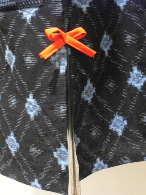 後ろは背中の部分に鉄媒染した美人画の日本手ぬぐい入れています。 この背中に配置したは日本手ぬぐいはお客様から大変、好評です。