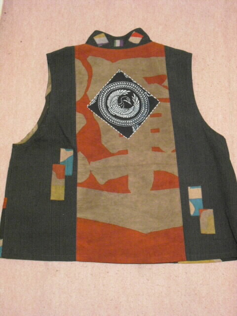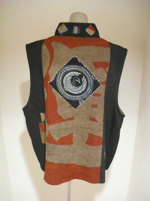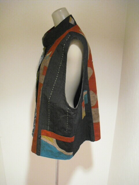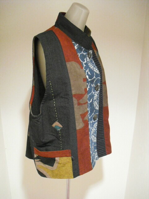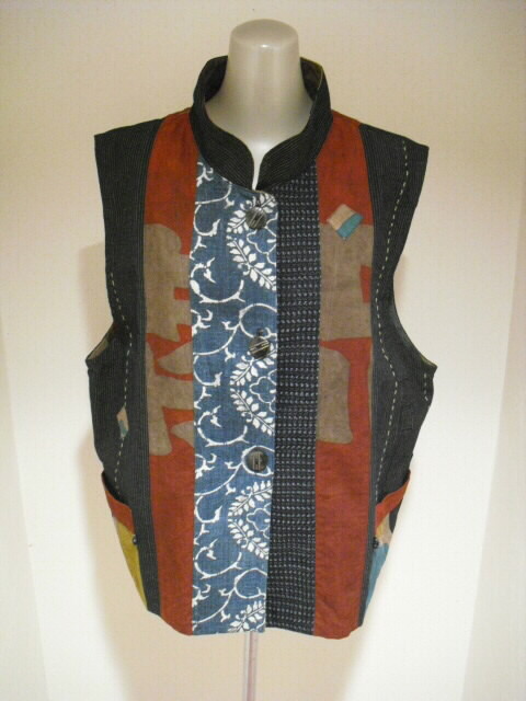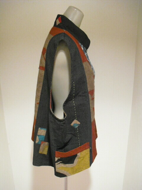 高価なリメイク素材を組み合わせて作った前開きベストです。