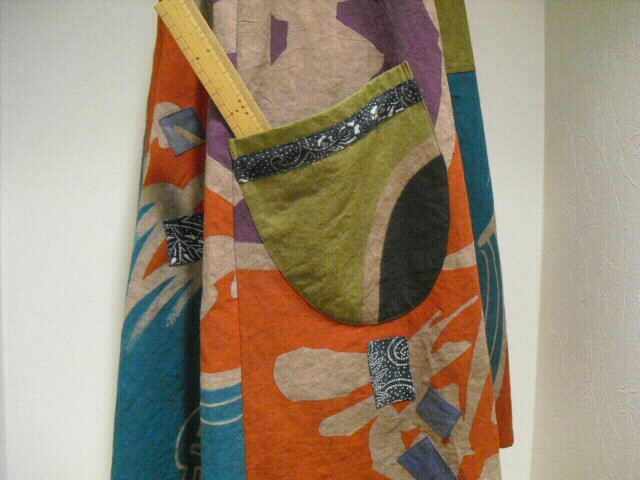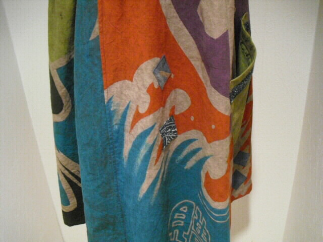 前は中央と左身頃の真中部分で斜めに切替えています。 色合いもデザインも前後で違った雰囲気です。