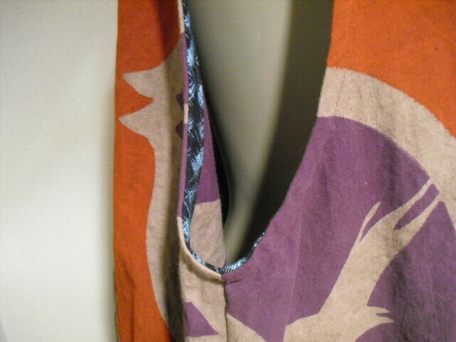 袖ぐりには幅1cmの絣のバイアステープを付けています。 袖口は大きく開けていますので肩や腕の動きも楽で、 インナーに厚手のものや重ね着をしても無理がありません。