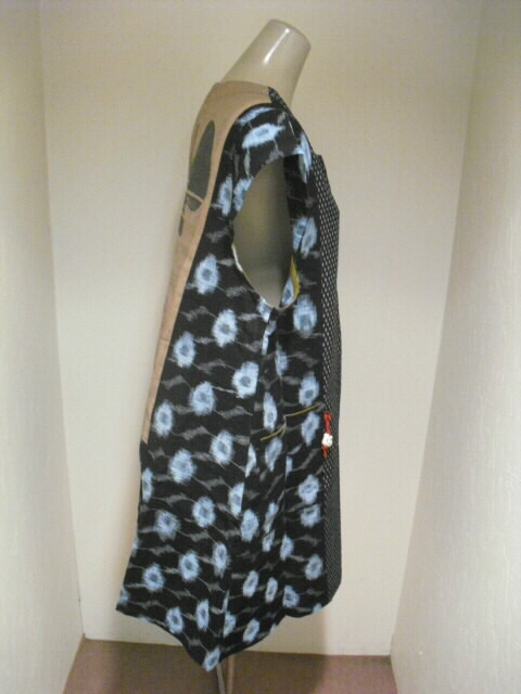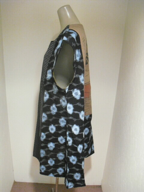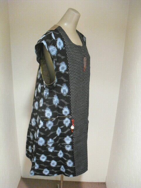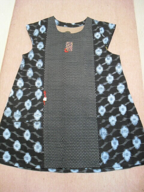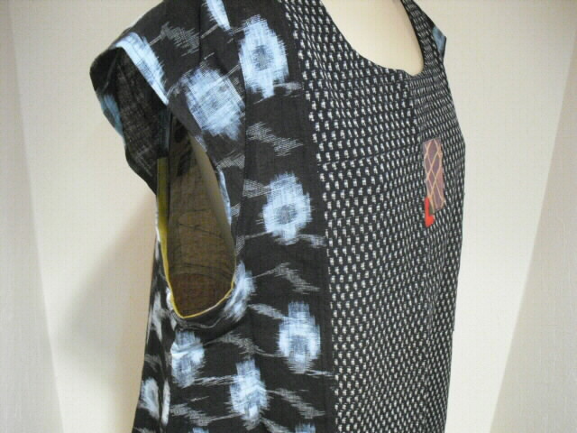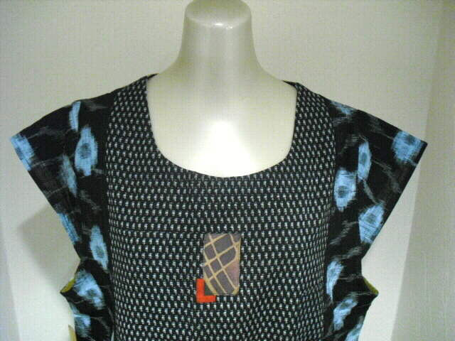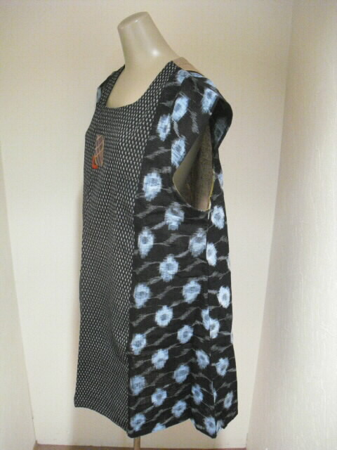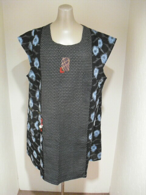 絣(かすり)、と鉄媒染した日本手ぬぐいを組合わせて作ったチュニックです。 前は正面で2種類の絣を切り替えて配置しました。 胸元にパッチした柿渋染め幟(のぼり)が素敵なアクセントになっています。