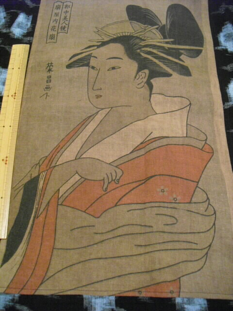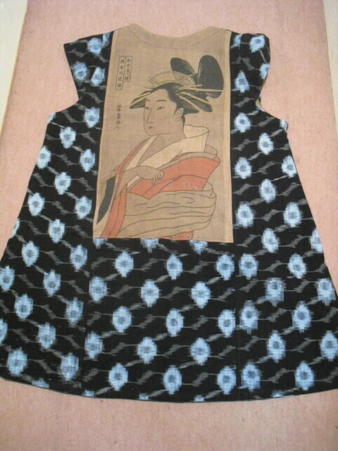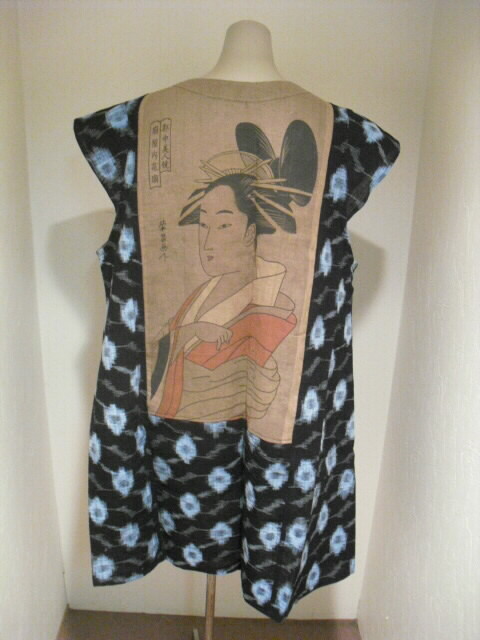 背中に配置した美人画の日本手ぬぐいは、柿渋染めをしてから鉄媒染で仕上げています。
