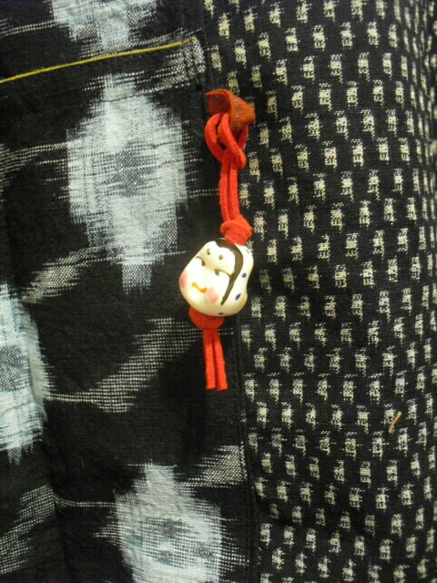 ポケット口は幟の布で補強と装飾。縁にはループ紐を付けています。 根付けなどの下げ飾りを付けて遊びごころを出してください。 (おかめ・ひょっとこの下げ飾りを付けています)