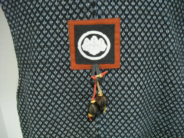 後ろは背中の部分に家紋の型染めをパッチしてループ紐に下げ飾りを付けています。 遊び心もタップリ。