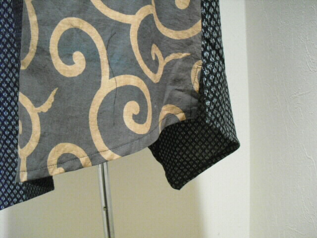 前は正面で2種類の絣を切り替えて左側に風呂敷を組合せました。 風呂敷の唐草模様が素敵なアクセントになっています。