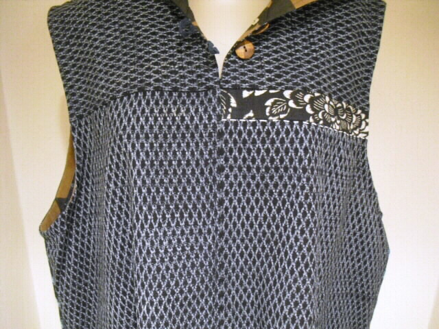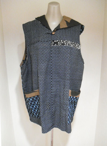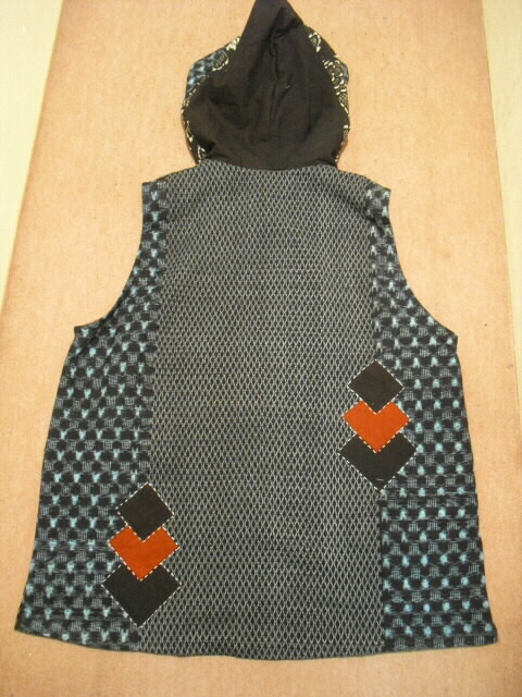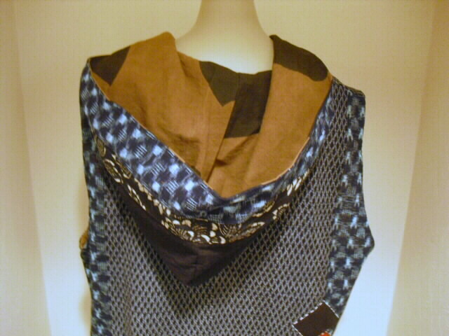 古布を組合せたフード付ベストです。 絣(かすり)をベースにして型染め、柿渋染めした武者絵幟を組み合わせています。 スッポリかぶれるデザインで、どなたにも気軽にお召し頂けます。 ゆったりサイズで気になるラインもカバーし楽な着心地です。 前は真中から縦へ、衿元から横へ切り替えています。 左身頃の衿元に入れた型染めが素敵なアクセントになっていてお洒落です♪
