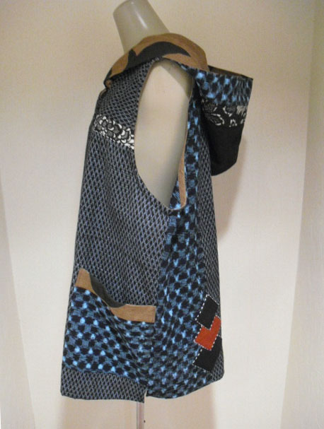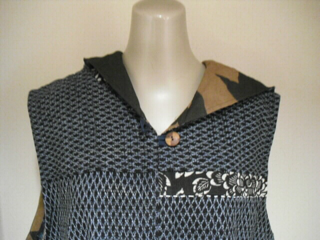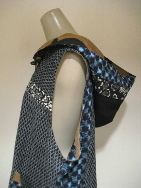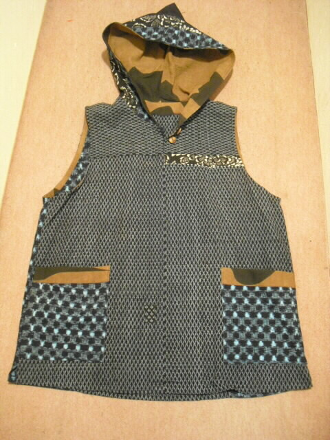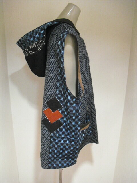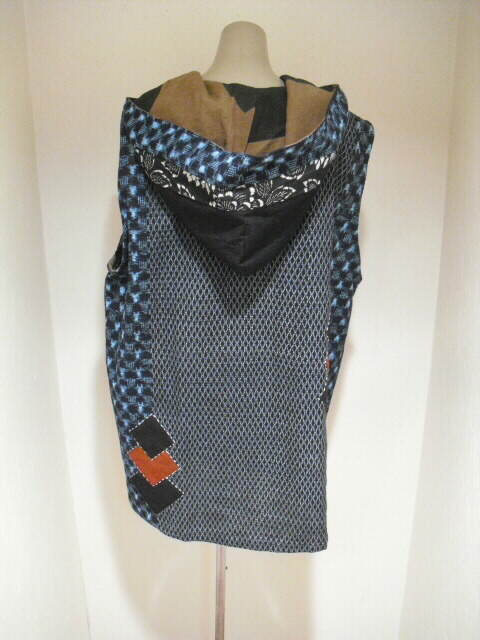 35cxm×横 25cmあります。 フードの外側は藍染綿、型染め、絣の3種類の生地の組合せで作り、裏は柿渋染めした武者絵幟を使っています。 袖ぐりには幅1cmの柿渋染めした武者絵幟のバイアステープを付けています。 袖口は大きく開けていますので肩や腕の動きも楽で、インナーに厚手のものや重ね着をしても無理がありません。