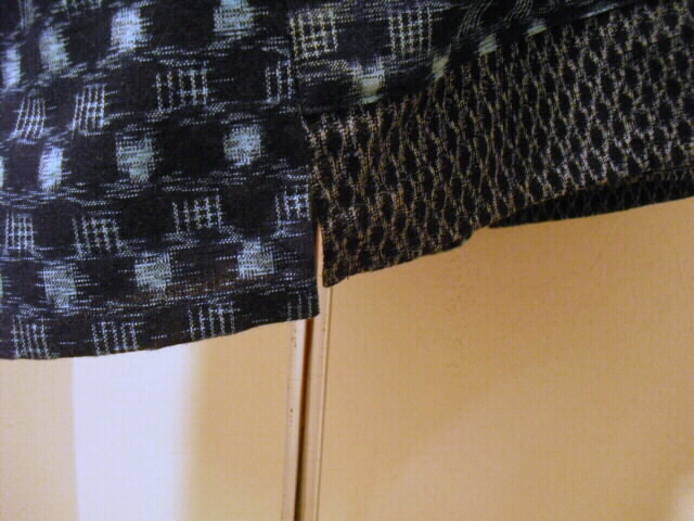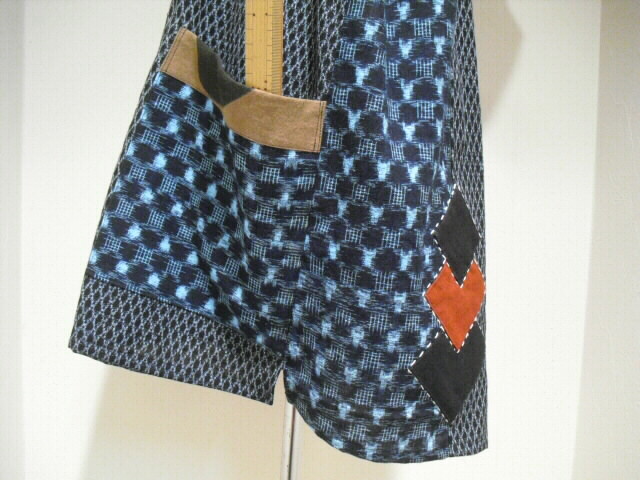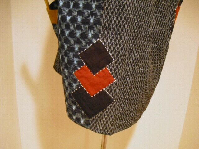 両脇も違う絣の切り替えています。 後は黒と朱色の別布を6枚パッチ。刺し子をして一手間加えてあります。 遊びごころもタップリです。