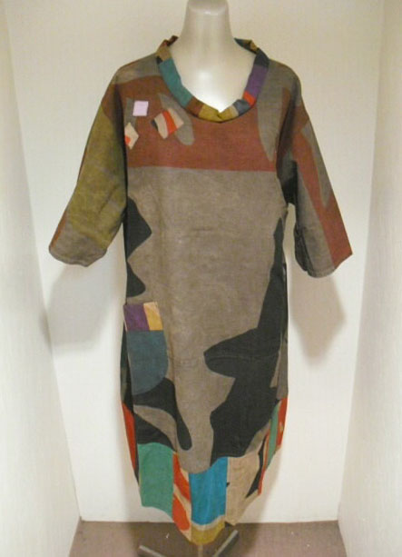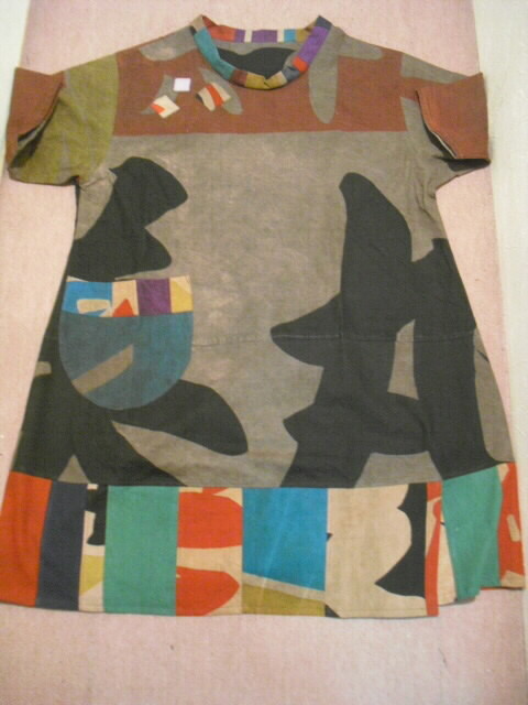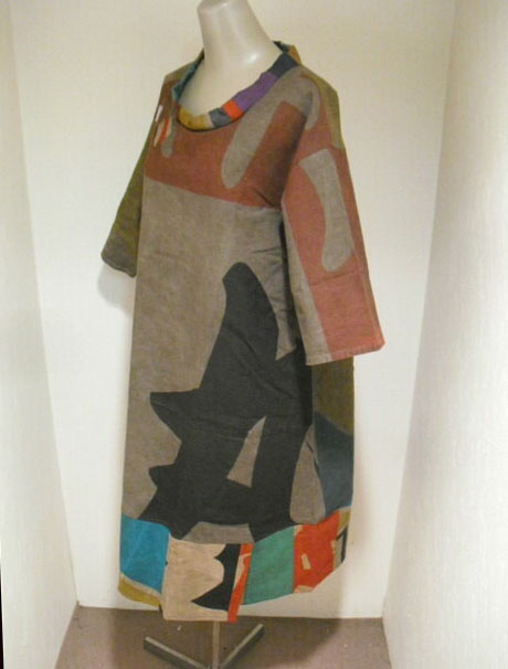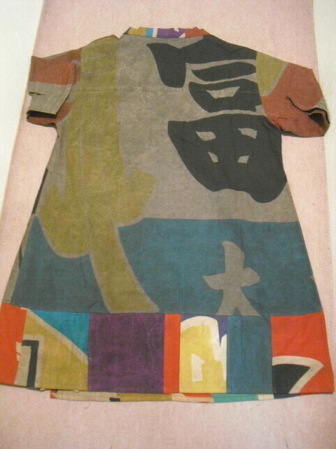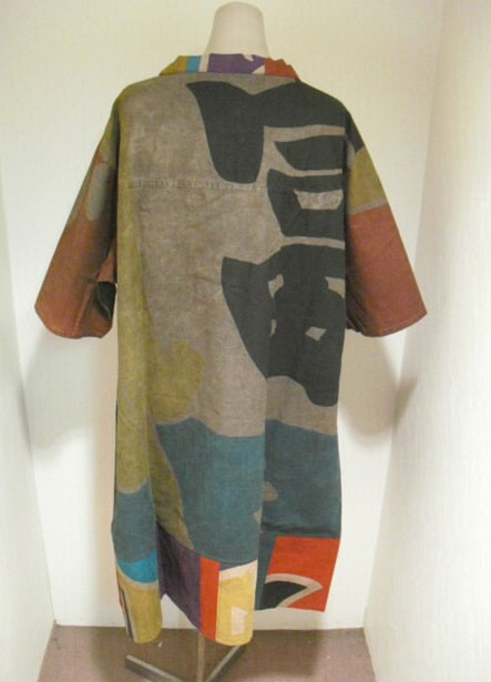 大漁旗をワンピースへリメイクしました。 色合いの派手さを抑えるために柿渋で染色、鉄媒染しています。