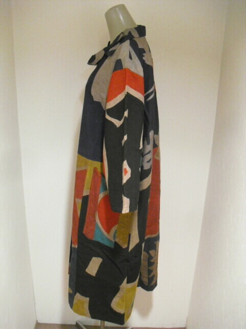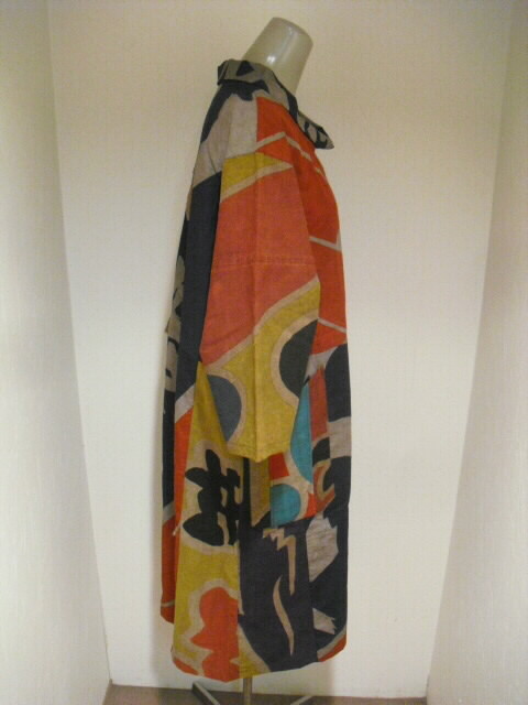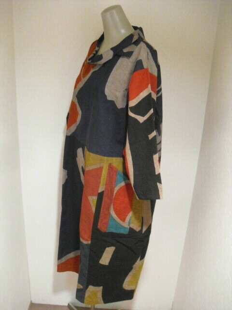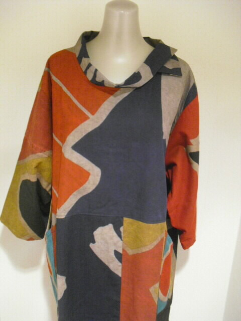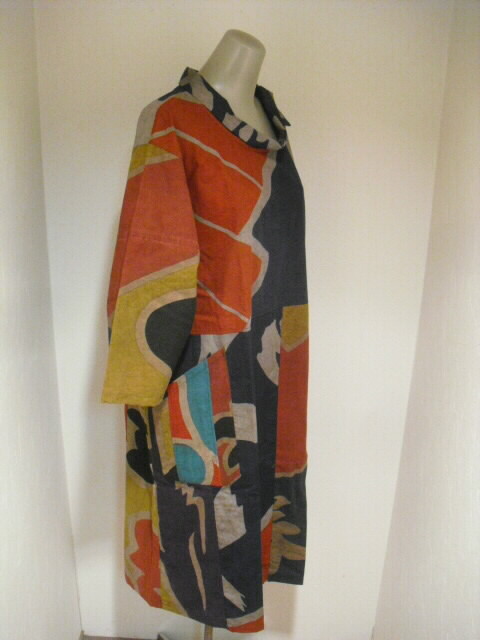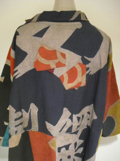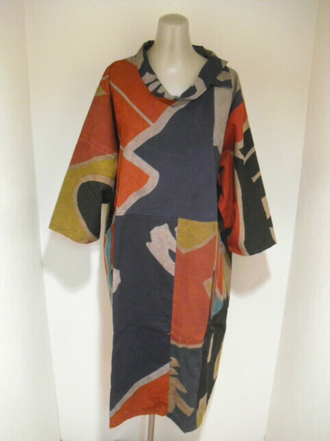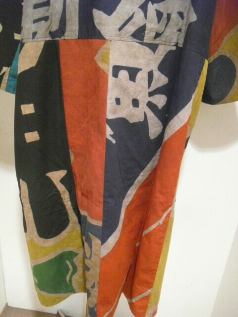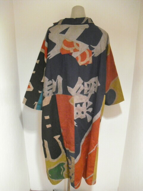 大漁旗をワンピースへリメイクしました。 色合いの派手さを抑えるために柿渋で染色、鉄媒染しています。